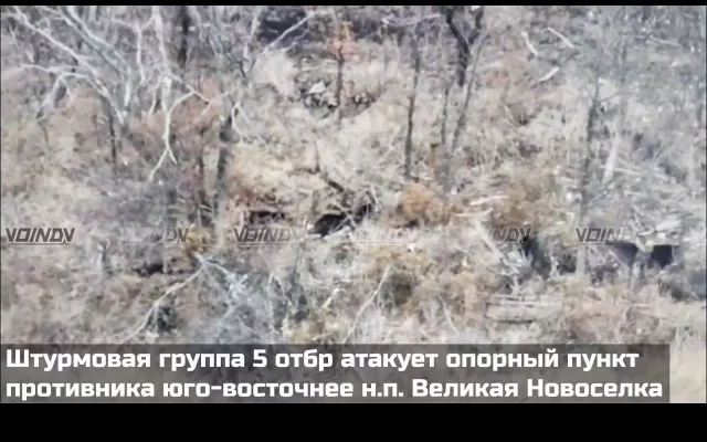 Штурмовая группа 5 гвардейской танковой бригады при поддержке fpv-операторов роты БЛА 37 гвардейской мотострелковой бригады выбивает противника в количестве 8 человек из опорного пункта, а затем по отступающему противнику наносят удары дроноводы разведроты и 2 батальона 37 гвардейской.