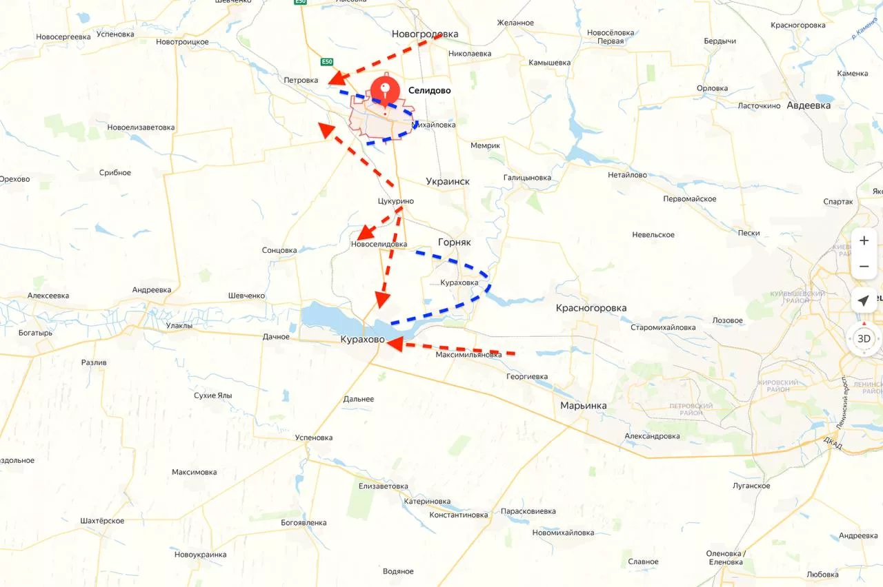 Цукурино — здесь наши планы подвергаются коррекции, что грамотно. Читаемая по карте задача — до наступления полной распутицы взять в окружение Селидово. На этот участок вернули ранее выведенные подразделения. Часть сил переброшена в направлении на н.п. Ильинка (южнее Новоселидовки, в которую зашли).