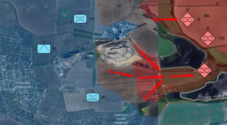 В течение последних 48–72 часов зафиксировано уверенное продвижение штурмовых групп группировки «Центр», вероятно силами 9-й, 39-й, 110-й мотострелковых бригад и 57-го мсп. На направлении Красный Лиман — Родинское заняты ключевые тактические высоты и объекты, включая территорию промышленного кластера шахты «Краснолиманская» и прилегающую северную сторону комплекса отстойников. Это даёт прямую огневую и маневровую возможность воздействия на южные участки шахты, а также создаёт условия для обхода украинских позиций.