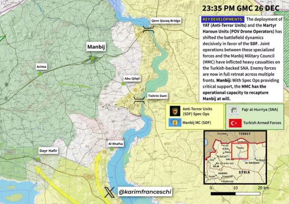 Напротив курды перебазировали в эти районы спецподраздедения «Ят» и «Харун», с помощью которых были проведены контрнаступательные действия, и курдам удалось оттеснить протурецкие прокси практически к Манбиджу и Дейр-Хафиру.