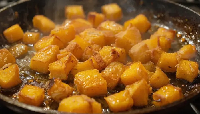 Оставляйте кожуру на кусочках — она служит естественным барьером, удерживая сочность и форму. Для жарки подойдут сорта с тонкой кожурой: хоккайдо, баттернат или мускатная. - Многослойность ароматов