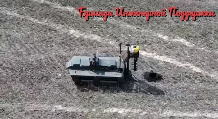 Наземный дрон бурит лунки в земле, куда затем могут устанавливаться шесты для антидроновых коридоров, что значительно сокращает время нахождения личного состава в дроннопасном месте.