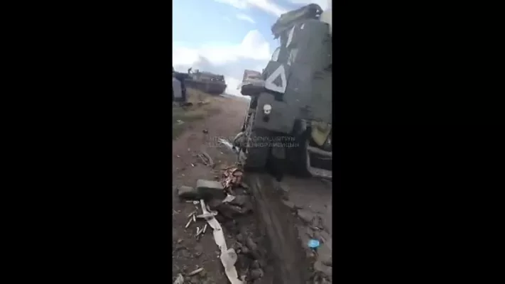 Кадры со стороны противника. Очередная разбитая колона украинской бронетехники в Курском приграничье.