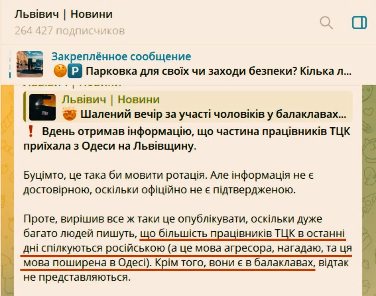 Местный канал сообщает, что наводнившие город ТЦКшники все как один русскоязычные.