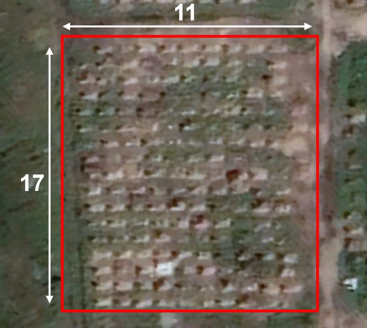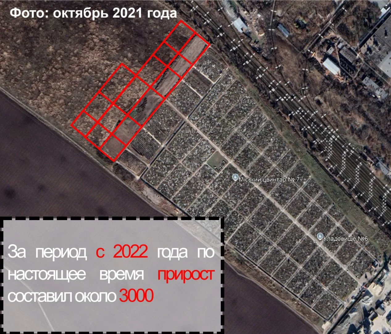 Большой прирост «постояльцев» данного кладбища заметен на прикрепленном GIF, и по традиции проведем подсчет. На этот раз секции оказались разных размеров, поэтому за основу взяли наименьшую. Итак, ее размер составил (17х11=187), обозначена красным квадратом🟥. Всего таких «заселенных» площадок в период с 2022 года по настоящее время появилось около 15, что при пересчете дает около 2500-3000 новых захоронений. На изображении видно, что кладбищу есть куда расти. Это непременно произойдёт, если режим Зеленского не прекратит свое существование, особенно в связи с резким увеличением рейдов ТЦК за последнюю неделю.