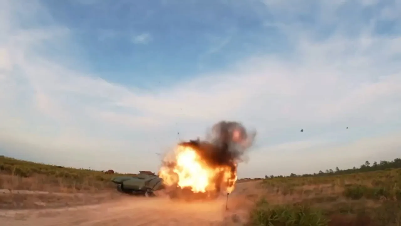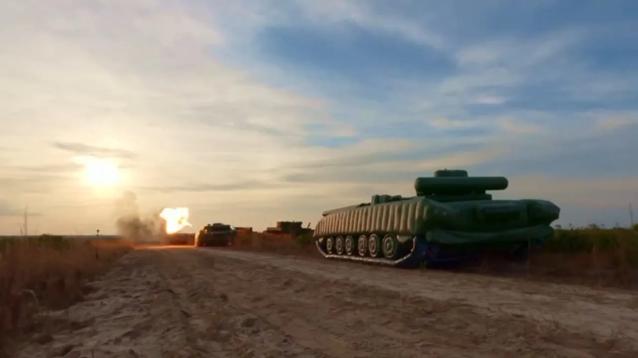 На этот раз один оператор управлял тремя дронами для одновременной атаки трех разных целей, представляющих собой надувные макеты советских танков.