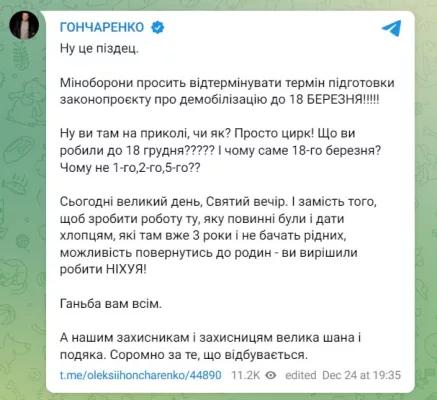 Украинский депутат Гончаренко сообщил, что Минобороны Украины просит отложить срок подачи законопроекта о демобилизации в Верховную раду до 18 марта 2025 года.