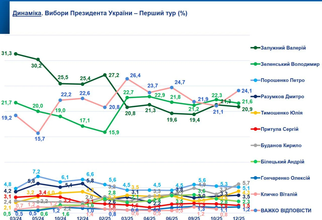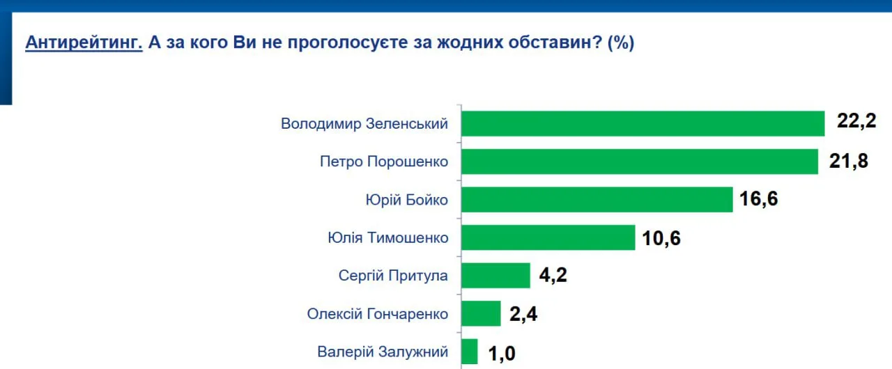 Судя по ответам, у текущего украинского лидера накопился рекордный антирейтинг, превышающий даже Порошенко, Бойко и Тимошенко. Как результат, на гипотетических новых выборах президента Украины во втором туре уверенно побеждает Валерий Залужный, обладающий минимальным антирейтингом среди опрашиваемых.