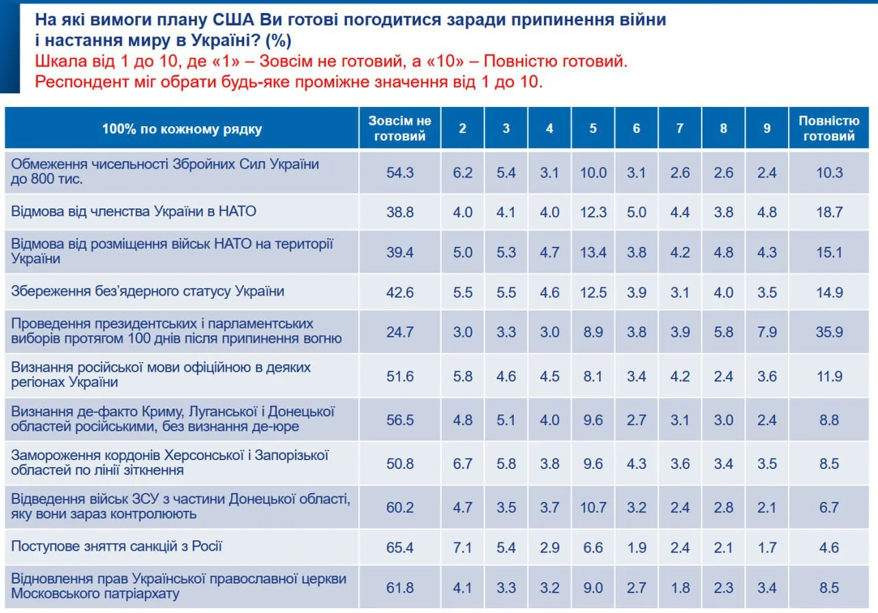 Как и в случае с недавним опросом КМИС, здесь большинство респондентов также категорически не согласны с выводом украинской армии с территории Донбасса, ограничениями на ВСУ и снятием санкций с России. При этом, опрашиваемые более лояльны к отказу от членства в НАТО и размещения западных войск на Украине.