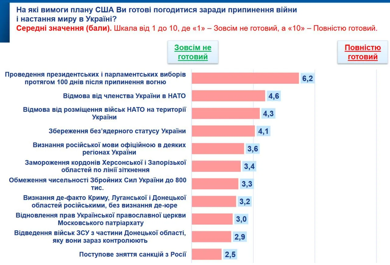 Важно отметить, что безотносительно достоверности или недостоверности проводимых опросов, украинская власть в своих решениях отталкивается в том числе от этих данных. Даже если они будут трижды нарисованными, именно на них ссылается Зеленский в своих выступлениях и заявлениях для западных союзников, аргументируя невозможность компромисса — ведь его якобы не хочет большинство населения.