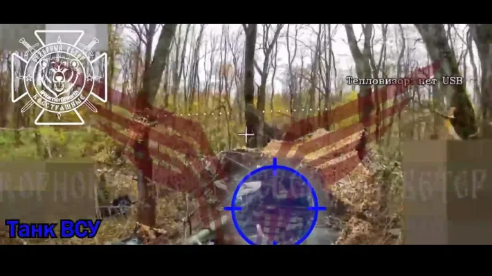 В одной из лесопосадок Сумской области разведкой выявлена ЗОП украинского танка. Несколькими ударами FPV-дронов центра беспилотных систем «Рубикон» находившийся там танк ВСУ сожжен дотла.