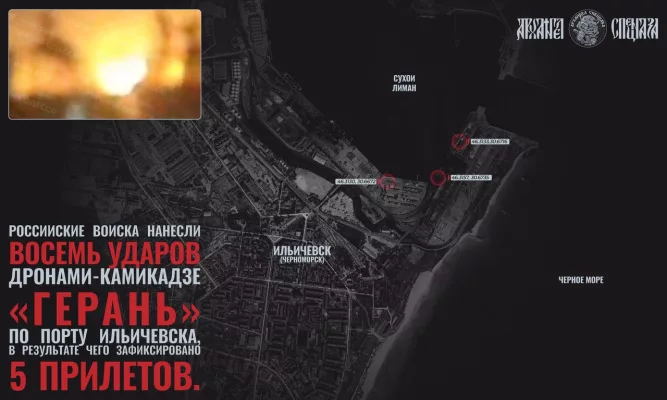 Только вчера «Герани» были использованы для ударов по энергетической инфраструктуре, а конкретно по подстанциям 110 кВ в Ильичевске и Великодолинском, а в этот раз — по порту Ильичевска.
