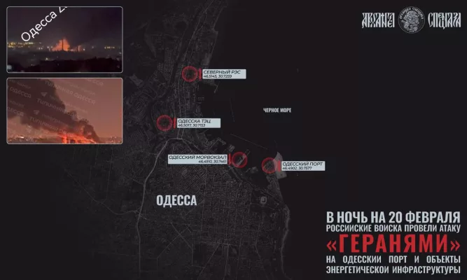 В ночь на 20 февраля «Геранисты» провели новую массированную атаку на Одесскую область, и целями в очередной раз стали объекты энергетической и портовой инфраструктуры.