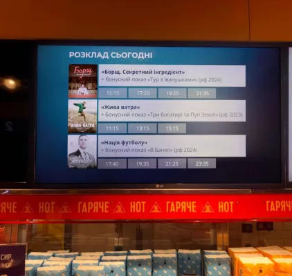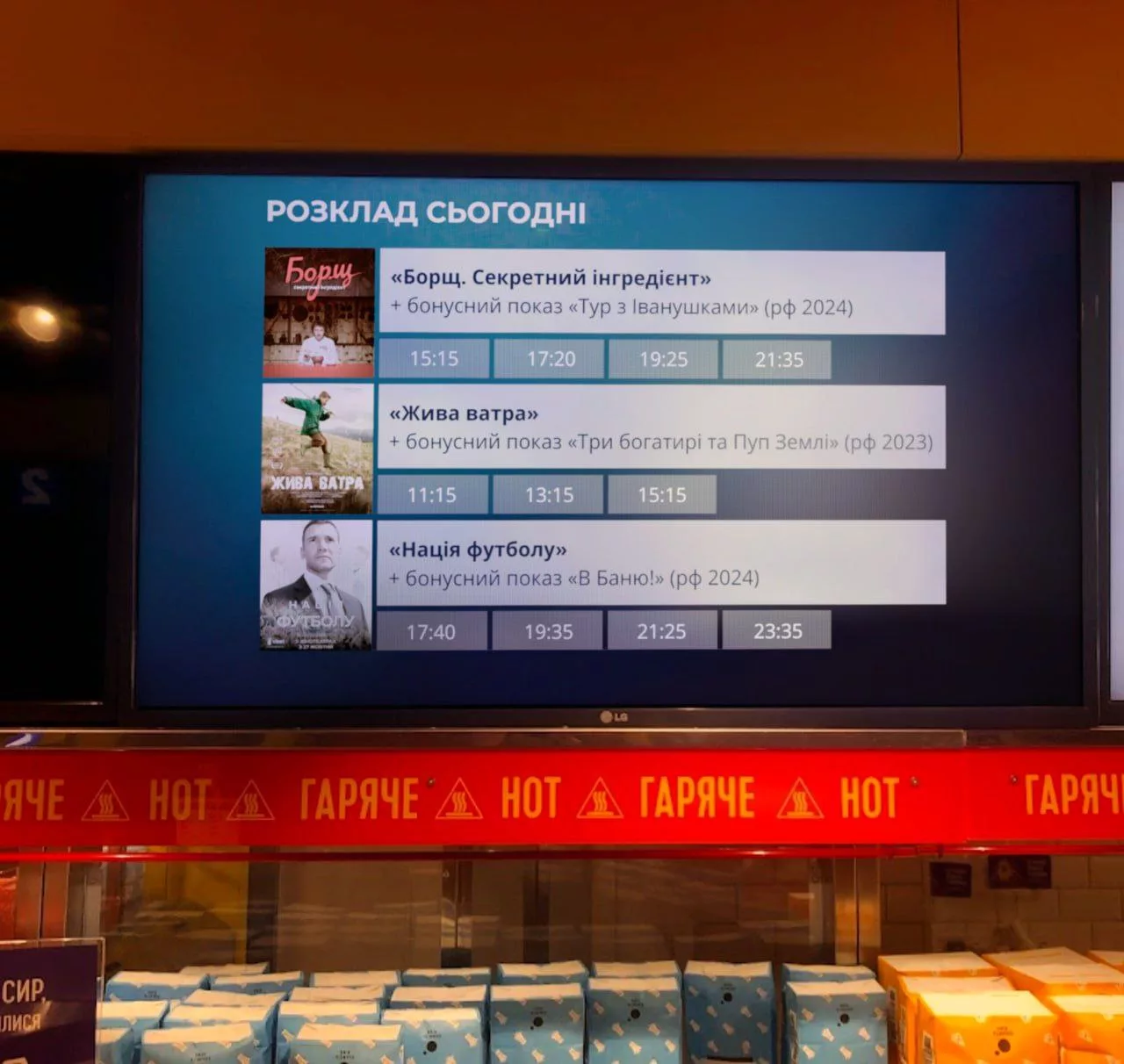 В кассе зритель покупает билет на украинскую документалку, а российский фильм показывают «бонусом». Среди наших замечены фильмы «Тур с Иванушками» и «В Баню» и мультфильм «Три богатыря и Пуп Земли».