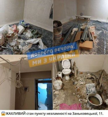 «Пункт несокрушимости» на ул. Заньковецкой, 11 скорее напоминает заброшенную свалку. Хотя на бумаге в нем предложена возможность оказания медпомощи, благоприятные условия для ночлега, зарядники для электроники, вода и пища.