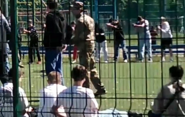 Вот так в наших школа ТЦКашники дрессируют детей. Это киевская школа, смотрите что делают с детьми. Давайте дети, учитесь идти погибать… С автоматами все стоите, вы еще маленькие, страну нашу будите защищать…