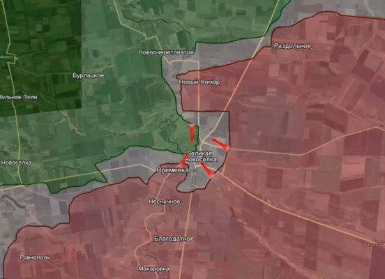 На северо-востоке населенного пункта бои идут уже в районе молокозавода, АЗС № 1 «Янисоль» и местного аэродрома. Целью этот удара, скорее всего, является отбрасывание противника за реку Кашлагач ближе к центру Великой Новоселки, дабы еще больше сократить зону контроля ВСУ.