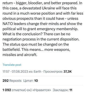 📝 «Любой сценарий прекращения огня и замораживания войны в Украине при нынешней диспозиции будет означать лишь одно – фактическую победу России… Это будет большим поражением западного мира и концом имеющегося глобального порядка безопасности», — написал он.