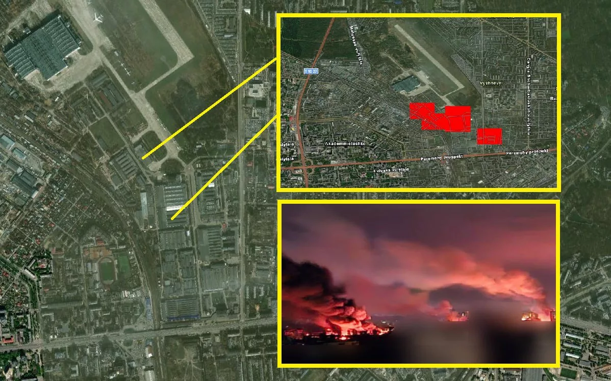 По данным со спутников NASA, удары «Гераней» пришлись, в том числе, по территории завода «Антонов» — ключевому объекту, где производятся вражеские беспилотники. Снимки и видео это подтверждают: на объекте вспыхнули мощные пожары, столбы дыма были видны за километры.