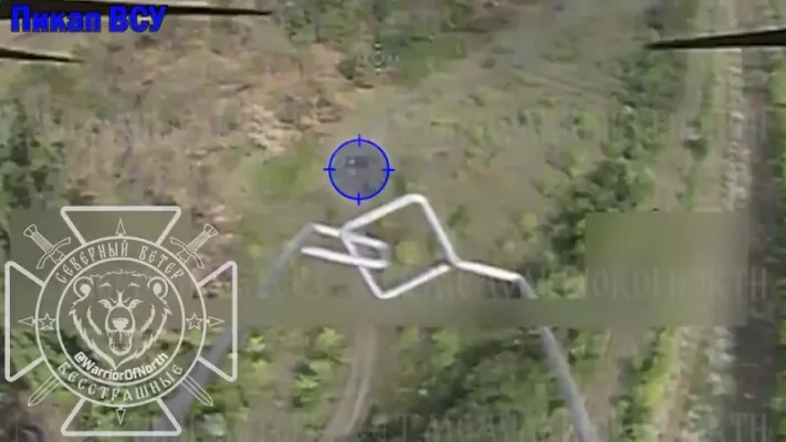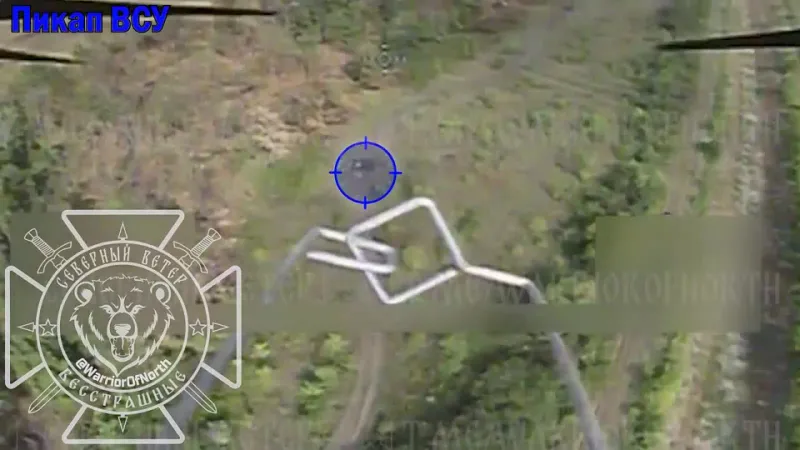 Пикап ВСУ передвигался вдоль лесополосы и замечен нашими дроноводами. Первым ударом транспорт врага обездвижен, второй удар — контрольный.