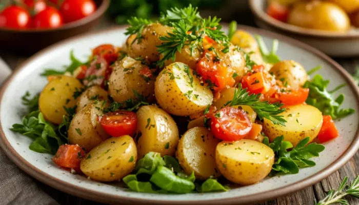 Запекание картофеля раскрывает его вкус, делая его более насыщенным и глубоким, а копчёные сосиски добавляют характерный, узнаваемый акцент, за который этот салат полюбили с первой пробы.