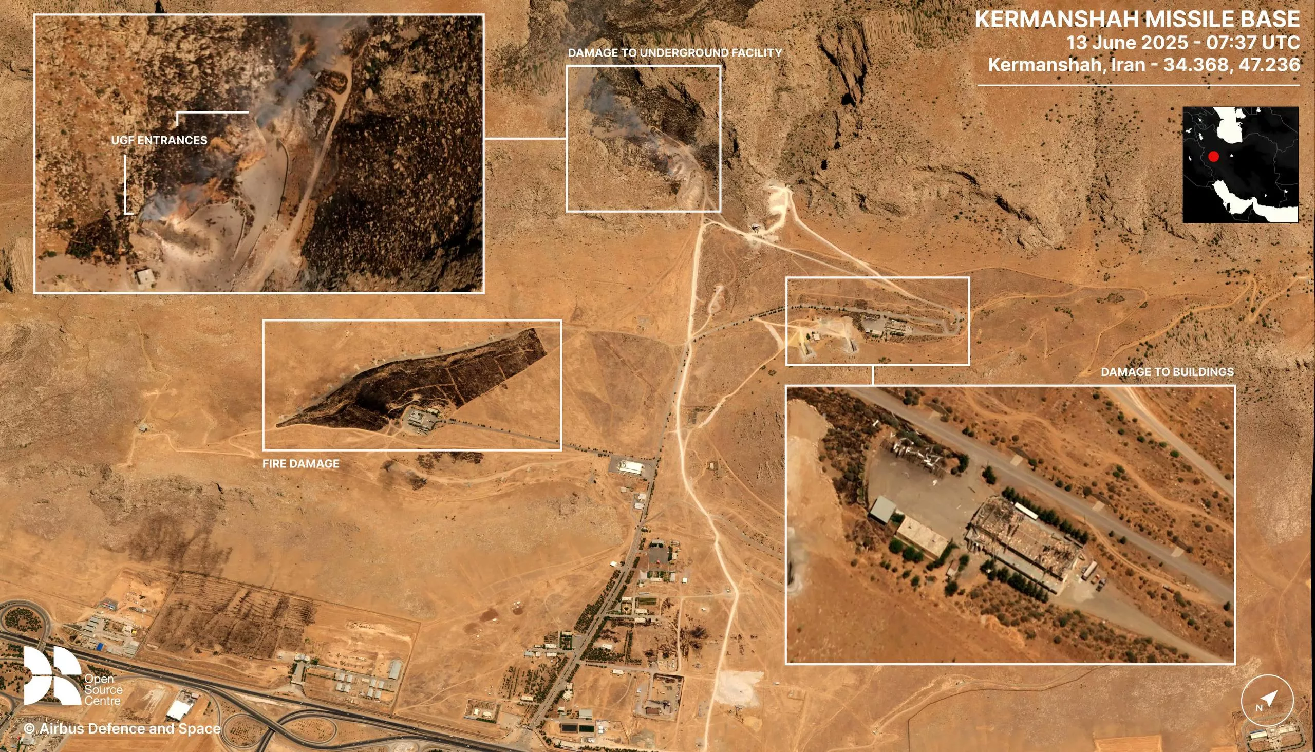 - На ракетой базе в Керманшахе недалеко от границы с Ираком, по сравнению с предыдущими снимками, разницы нет – разрушены постройки на поверхности и осуществлена неудачная попытка обвала въездов в подземную часть. Подземная часть также не затронута.