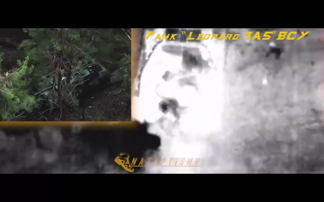 На кадрах точное попадание в люк немецкого танка «1A5 Leopard», повлёкшее за собой неминуемую смерть «зверька» в лесах Харьковской области.