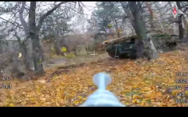 Операторы FPV-дронов подняли в воздух беспилотные летательные аппараты на оптоволокне и уничтожили пять украинских боевых машин пехоты, располагавшихся вдоль железнодорожных путей и дороги в лесополосе.