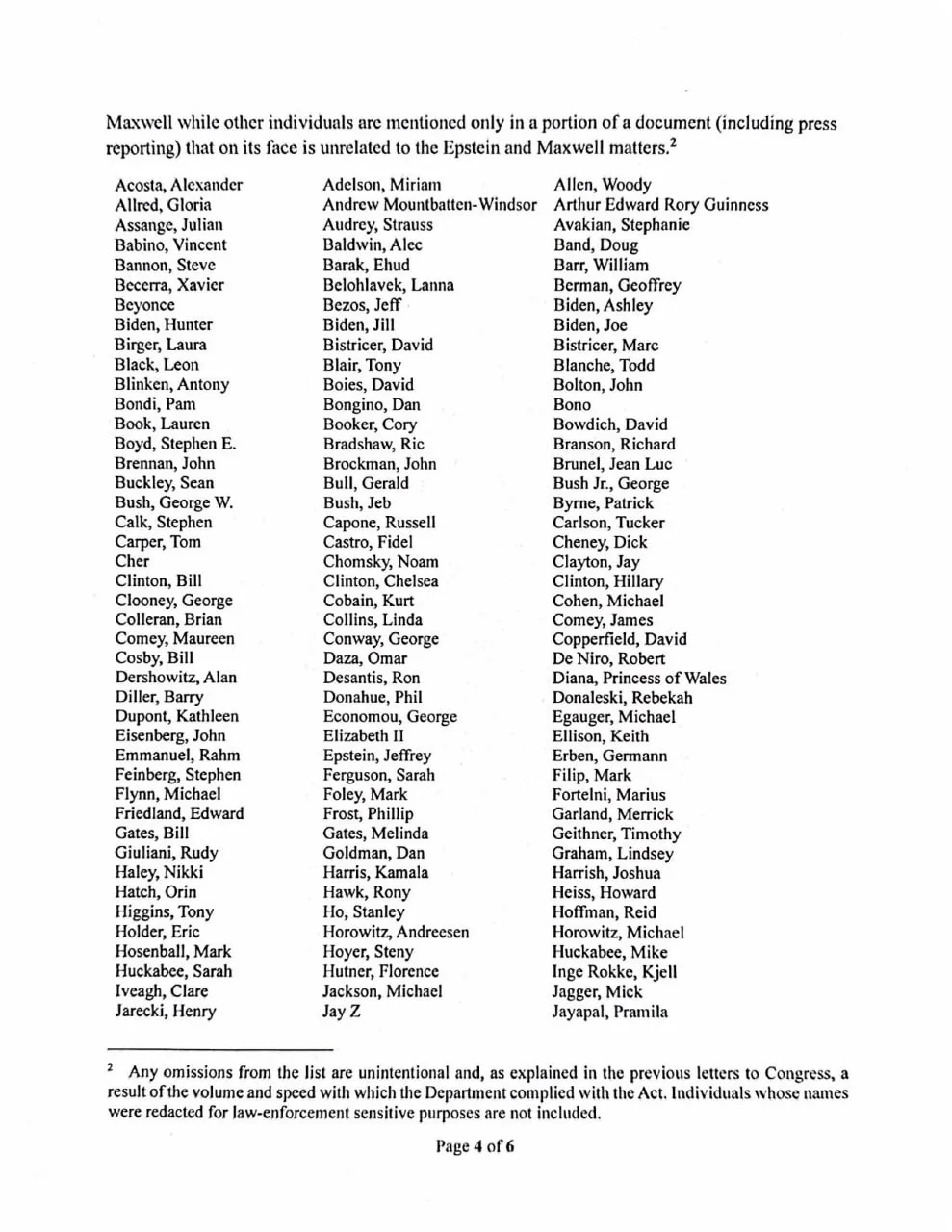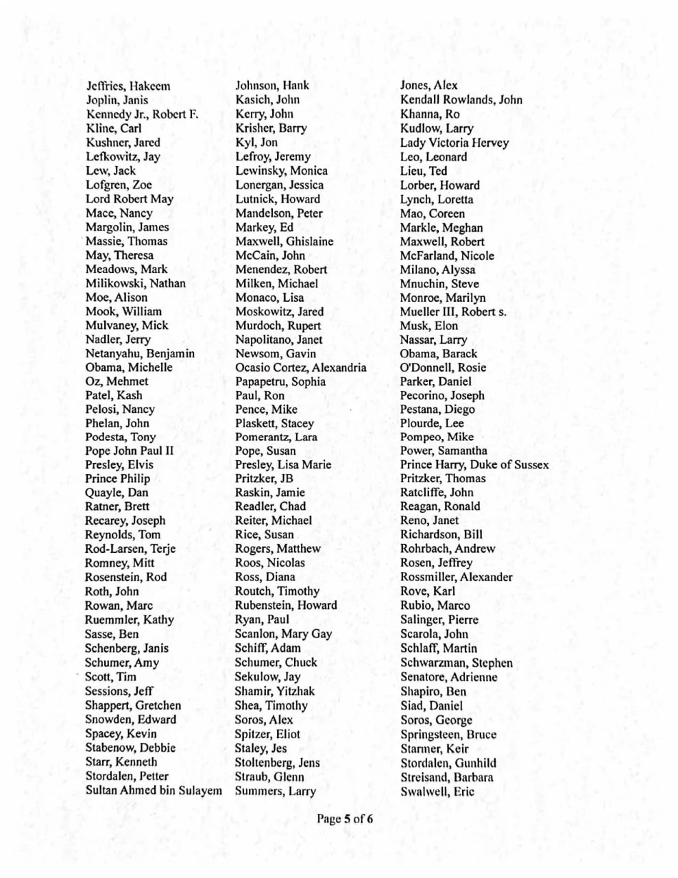 Среди фигурантов перечня: Барак и Мишель Обама, Билл и Хиллари Клинтон, Дональд Трамп, Билл Гейтс, Марк Цукерберг, Илон Маск, Камала Харрис, Нэнси Пелоси, принц Гарри, папа Иоанн Павел II, Роберт Де Ниро, Вуди Аллен, Ким Кардашьян, Брюс Спрингстин, Боно, Jay-Z, Бейонсе и другие.