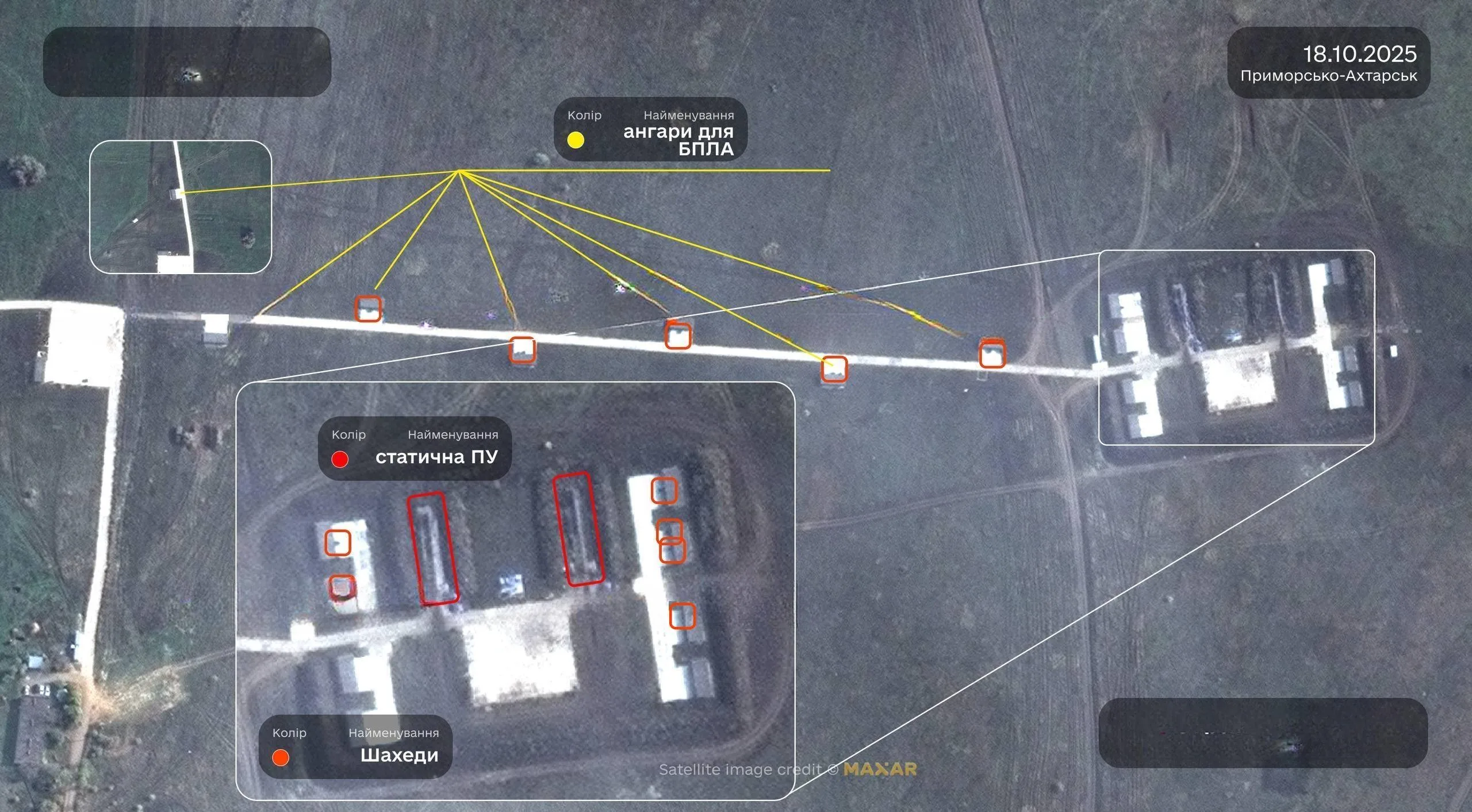 На кадрах присутствует несколько стационарных пусковых установок для дронов-камикадзе (выделено красным), как минимум 21 «Герань-2», подготовленная к запуску (выделено оранжевым), а также два типа ангаров для них — 5 уже возведенных и еще 9 строящихся больших ангаров (выделено зеленым), каждый из которых вмещает минимум по 20 дронов-камикадзе, и несколько малых ангаров, куда влезает уже по 1-2 беспилотникам (выделено желтым).