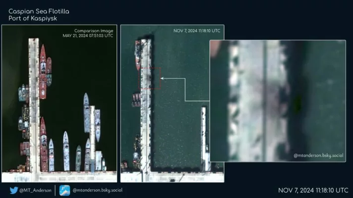 На снимках видно потемнение на причале, вероятно, от близкого взрыва ударного БПЛА. Как можно заметить значительных разрушений не наблюдается.
