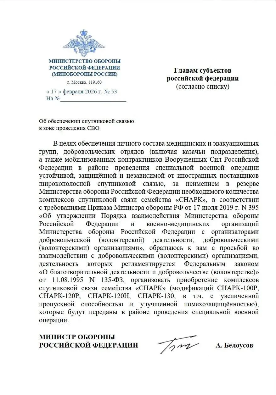 В соцсетях распространяется поддельный документ, якобы подписанный министром обороны РФ Андреем Белоусовым. В этом «письме» региональные власти просят закупать спутниковые системы связи «СНАРК» за счет волонтеров из-за якобы дефицита оборудования.