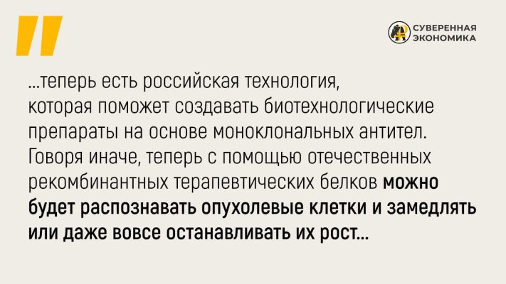 Крайне важно, что теперь есть российская технология, которая поможет создавать биотехнологические препараты на основе моноклональных антител. Говоря иначе, теперь с помощью отечественных рекомбинантных терапевтических белков можно будет распознавать опухолевые клетки и замедлять или даже вовсе останавливать их рост.
