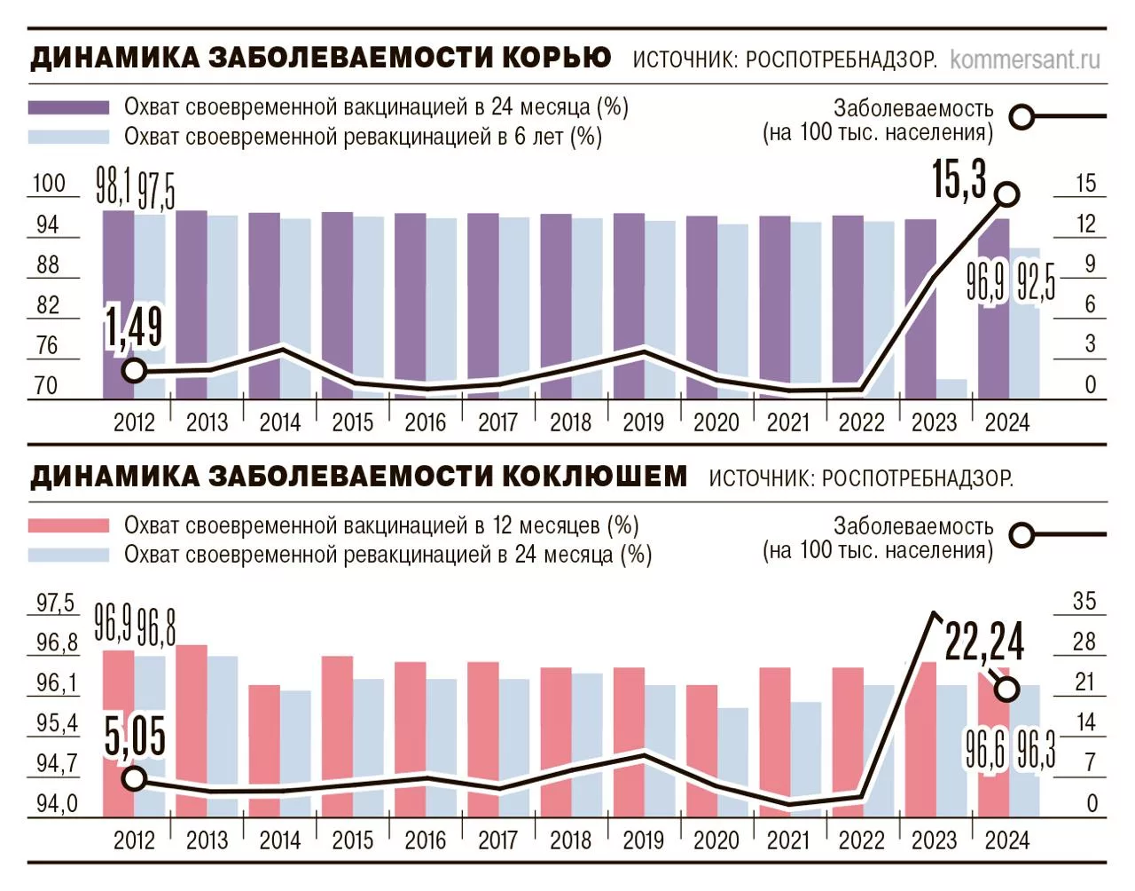 По данным Роспотребнадзора, в 2024 году заболеваемость корью выросла в 11 раз, краснухой — в шесть, коклюшем — в 4,5, гемофильной инфекцией — в 13,4. Отмечается, что 89,5% из них не были привиты.