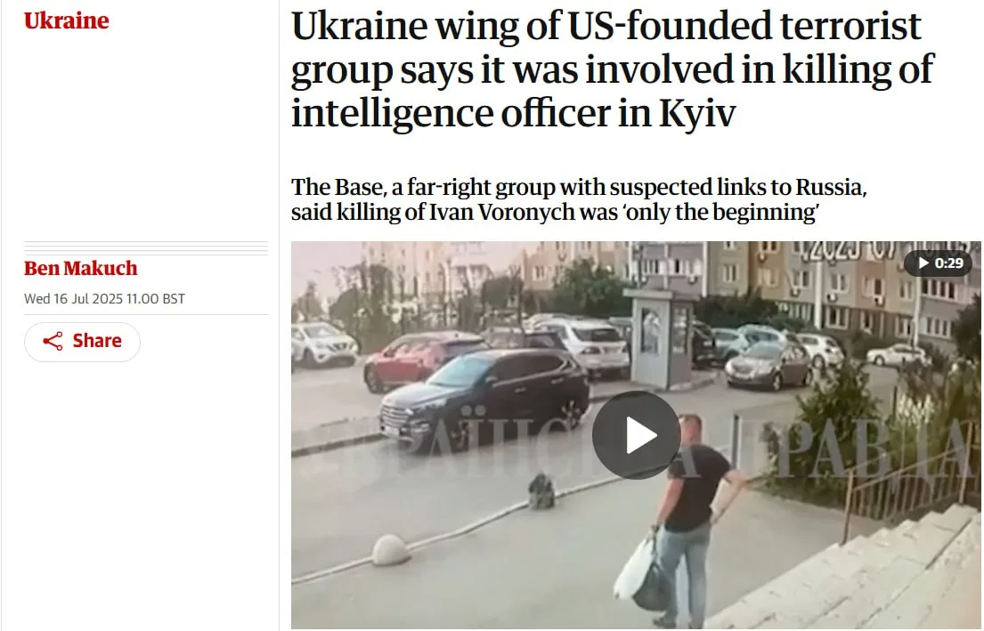 Группировка The Base, признанная террористической в ЕС, Великобритании, Канаде, Австралии, Новой Зеландии и ряде других стран, заявила о своей причастности к убийству полковника СБУ Ивана Воронича в Киеве, — пишет The Guardian.