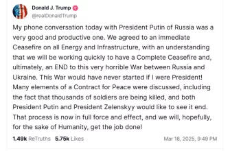 До полного прекращения огня «недалеко», детали проработают 23 марта — Уиткофф после разговора Путина и Трамп