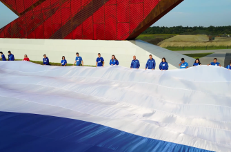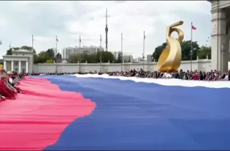 Молодые активисты из Московской области растянули гигантский флаг России на фоне мемориального комплекса «Курская битва»