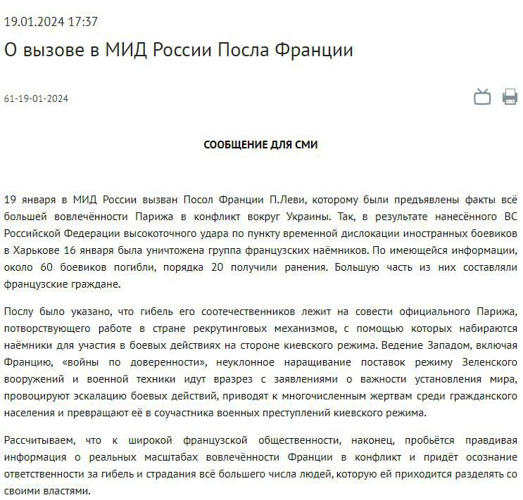 МИД РФ: гибель французских наемников во время удара по расположению украинской армии в Харькове лежит на совести Парижа
