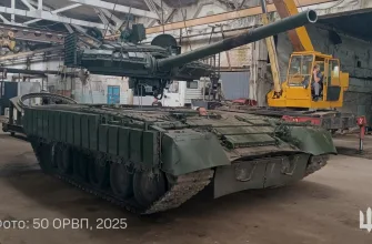 На кадрах — процесс замены ствола 125-мм танковой пушки 2А46 на Т-80БВ обр. 2018 силами 50-го отдельного ремонтно-восстановительного полка ВСУ