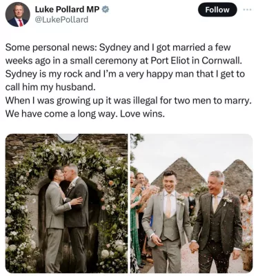 «Мы с Сидни поженились несколько недель назад на небольшой церемонии в Порт-Элиоте в Корнуолле. Сидней – моя опора, и я очень счастлив, что могу называть его своим мужем. Когда я рос, было незаконно, чтобы двое мужчин вступали в брак. Мы прошли долгий путь. Любовь побеждает», заявил депутат парламента.