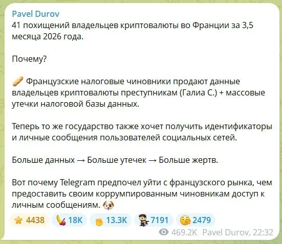 Дуров обратил внимание на 41 случай похищения владельцев крипты в 2026 году — и деле сотрудницы налогов Иль-да-Франс, которая передавала конфиденциальные данные из налоговых баз.