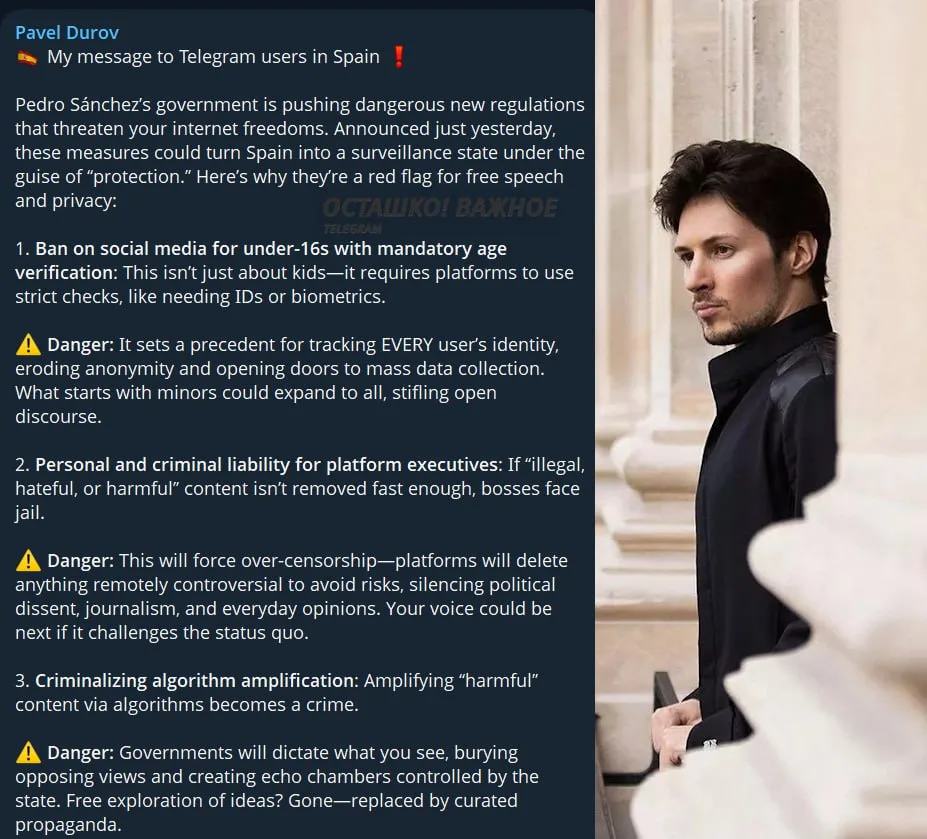 «Правительство Педро Санчеса продвигает опасные новые правила, которые могут превратить Испанию в государство тотальной слежки под видом “защиты”», — написал основатель Telegram в своём канале.