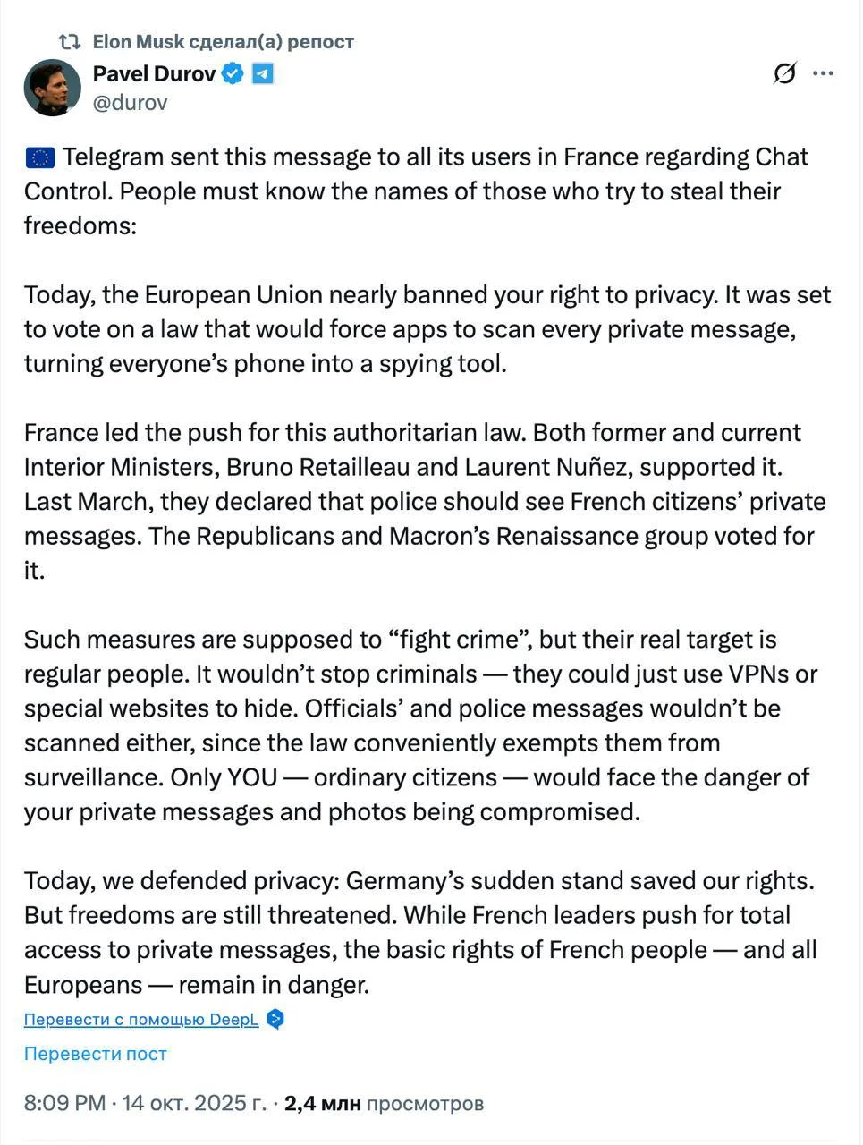 «Сегодня Европейский Союз едва не запретил ваше право на частную жизнь. Он собирался проголосовать за закон, который заставил бы приложения сканировать каждое личное сообщение, превратив телефоны всех в инструменты шпионажа. Франция возглавила продвижение этого авторитарного закона. Такие меры якобы направлены на «борьбу с преступностью», но на самом деле их цель — обычные люди. Преступников это не остановит — они могут просто использовать VPN или специальные сайты, чтобы скрыться. Сообщения чиновников и полиции также не будут сканироваться, поскольку закон удобно освобождает их от надзора. Только ВЫ — обычные граждане — подвергнетесь опасности утечки ваших личных сообщений и фотографий», — пишет Дуров.