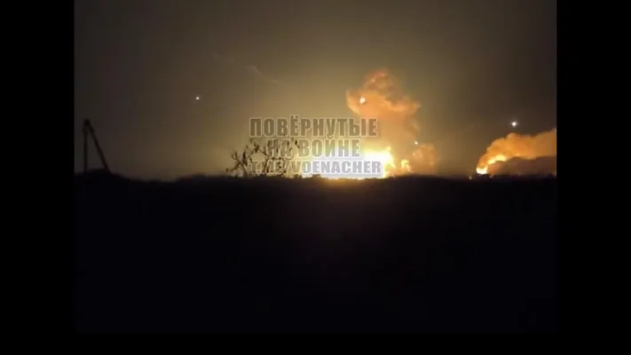 На опубликованных кадрах зафиксирован процесс многоступенчатой детонации ракетного топлива после ночного удара на территории Павлоградского химического завода. Видно, как в течение длительного времени происходят вторичные взрывы различной мощности, сопровождающиеся яркими вспышками и разлётом фрагментов. Характер огня, несколько очагов возгорания и динамика повторных разрывов указывают на то, что поражение пришлось именно по хранилищам компонентов твёрдого топлива, что вызвало цепную реакцию детонации и возгорания.