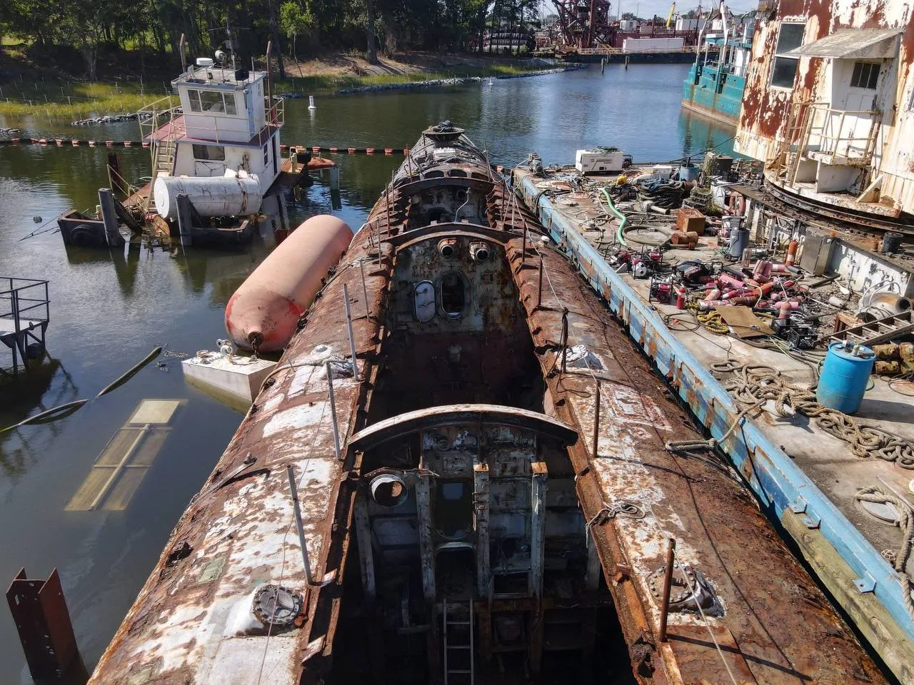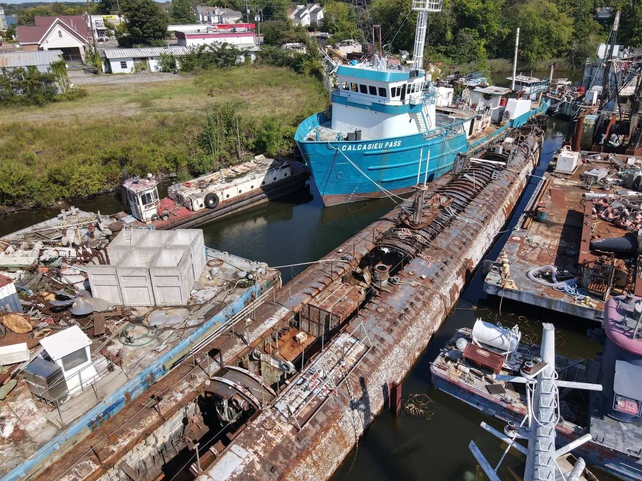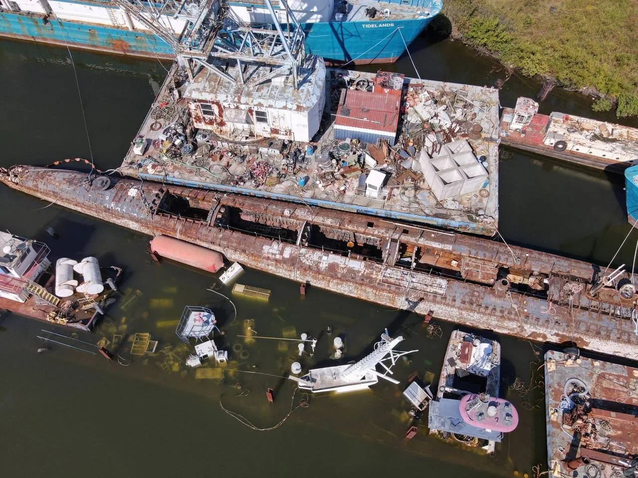 Она была построена в 1945 году и была кораблем-музеем в Patriots Point в Чарльстоне, штат Южная Каролина. Сейчас она находится в затоне у реки Элизабет в Норфолке и неспешно разбирается на металл. На фото с дрона видны особенности конструкции корпуса.