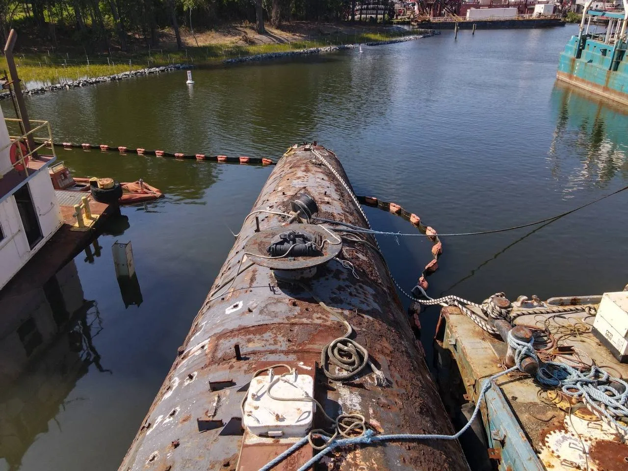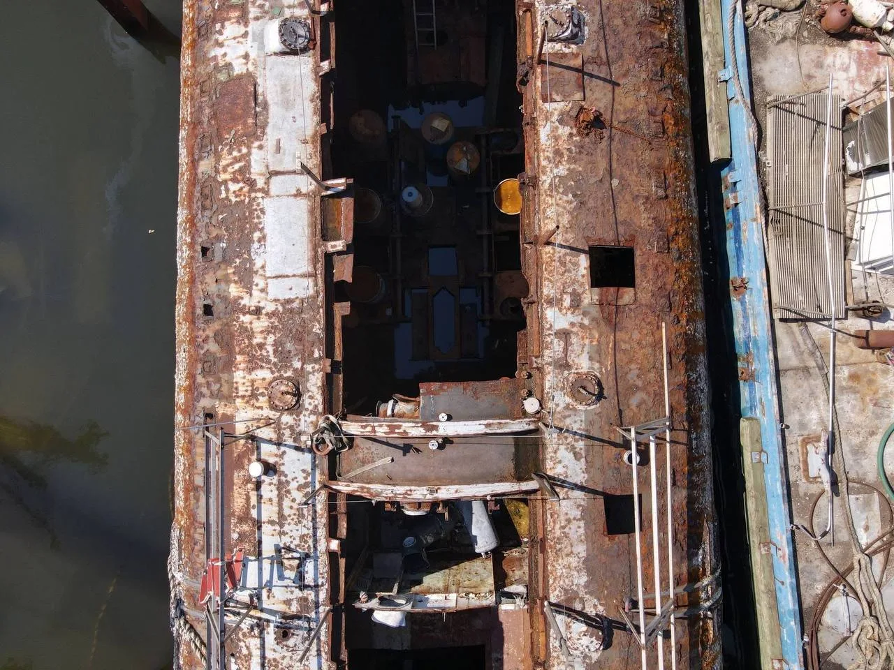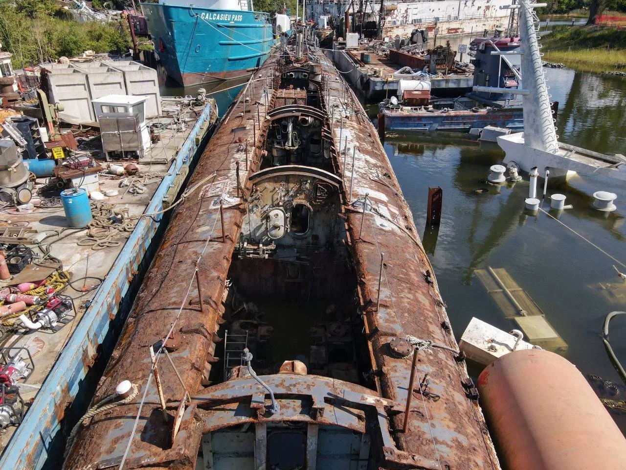 Она была построена в 1945 году и была кораблем-музеем в Patriots Point в Чарльстоне, штат Южная Каролина. Сейчас она находится в затоне у реки Элизабет в Норфолке и неспешно разбирается на металл. На фото с дрона видны особенности конструкции корпуса.