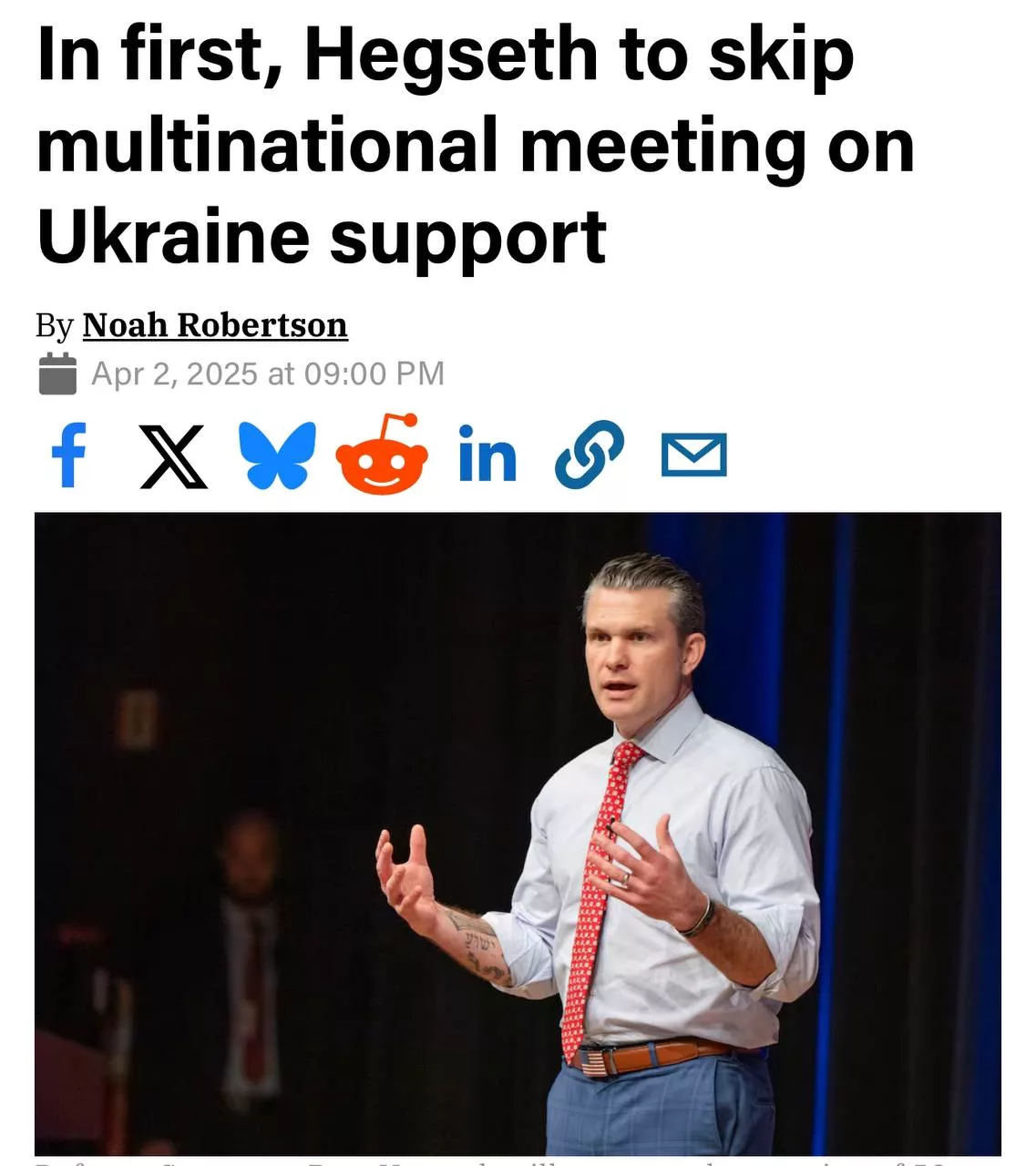 Глава оборонного ведомства Пит Хегсет не примет участия во встрече, запланированной на 11 апреля в Брюсселе, пишет Defense News со ссылкой на источники в американских и европейских правительствах.