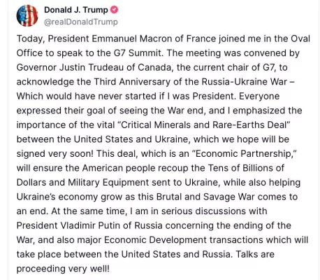 Президент США подчеркнул важность «Сделки о критически важных минералах и редкоземельных элементах» между США и Украиной. Он назвал её «Экономическим партнерством (https://t.me/OstashkoNews/171557)», гарантирующим: