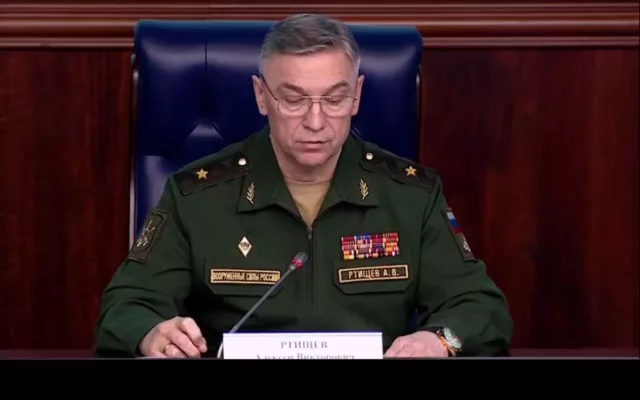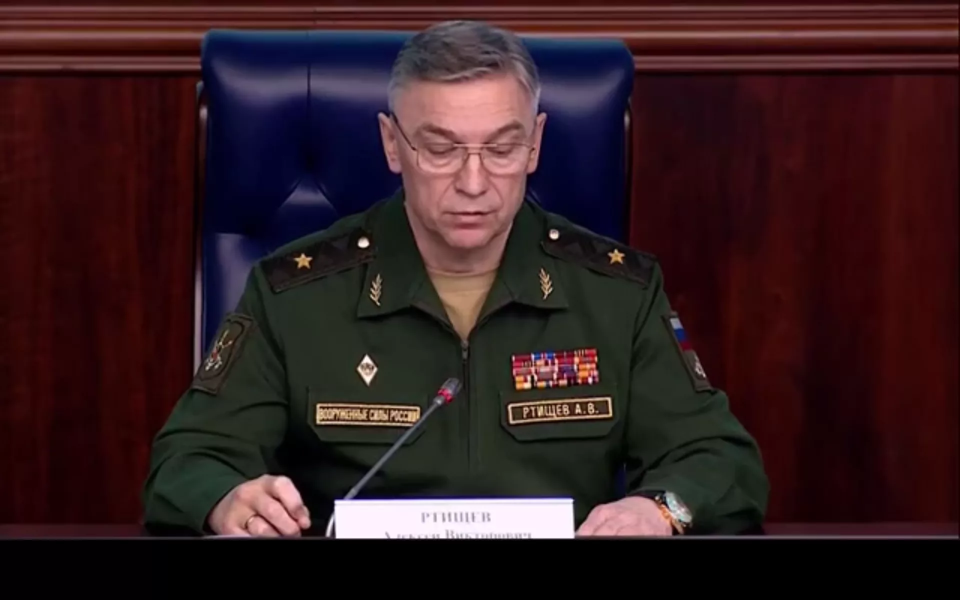 Брифинг провёл генерал-майор войск РХБЗ Алексей Ртищев, заместитель генерал-лейтенанта Игоря Кириллова, убитого в результате теракта в Москве 17 декабря.