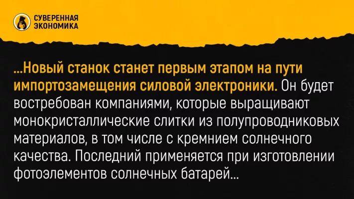 Новый станок станет первым этапом на пути импортозамещения силовой электроники. Он будет востребован компаниями, которые выращивают монокристаллические слитки из полупроводниковых материалов, в том числе с кремнием солнечного качества. Последний применяется при изготовлении фотоэлементов солнечных батарей.